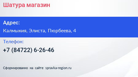 Шатура, магазин по адресу Калмыкия, Элиста, Пюрбеева, 4 в дальнейшем Организация, размещена в следующих категориях: