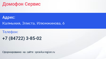 Домофон-Сервис по адресу Калмыкия, Элиста, Илюмжинова, 6 в дальнейшем Организация, размещена в следующих категориях: