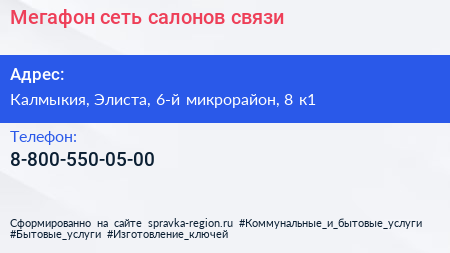 Мегафон, сеть салонов связи по адресу Калмыкия, Элиста, 6-й микрорайон, 8 к1 в дальнейшем Организация, размещена в следующих категориях: