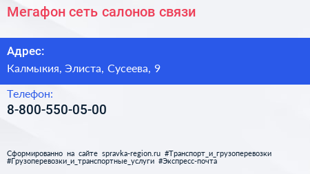 Мегафон, сеть салонов связи по адресу Калмыкия, Элиста, Сусеева, 9 в дальнейшем Организация, размещена в следующих категориях: