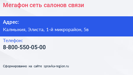 Мегафон, сеть салонов связи по адресу Калмыкия, Элиста, 1-й микрорайон, 5в в дальнейшем Организация, размещена в следующих категориях: