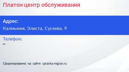 Платон, центр обслуживания по адресу Калмыкия, Элиста, Сусеева, 9 в дальнейшем Организация, размещена в следующих категориях: