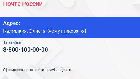 Почта России по адресу Калмыкия, Элиста, Хомутникова, 61 в дальнейшем Организация, размещена в следующих категориях:
