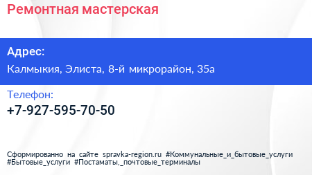 Ремонтная мастерская по адресу Калмыкия, Элиста, 8-й микрорайон, 35а в дальнейшем Организация, размещена в следующих категориях: