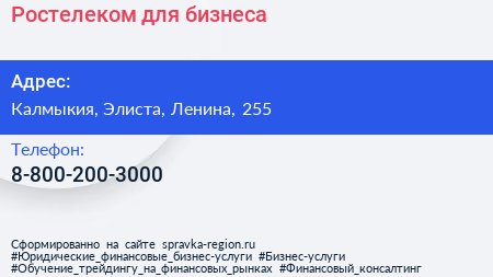 Ростелеком для бизнеса по адресу Калмыкия, Элиста, Ленина, 255 в дальнейшем Организация, размещена в следующих категориях: