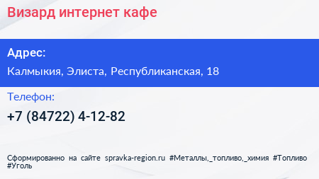 Визард, интернет-кафе по адресу Калмыкия, Элиста, Республиканская, 18 в дальнейшем Организация, размещена в следующих категориях: