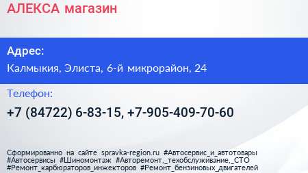 АЛЕКСА, магазин по адресу Калмыкия, Элиста, 6-й микрорайон, 24 в дальнейшем Организация, размещена в следующих категориях: