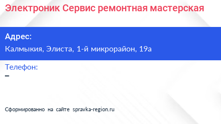 Электроник-Сервис, ремонтная мастерская по адресу Калмыкия, Элиста, 1-й микрорайон, 19а в дальнейшем Организация, размещена в следующих категориях: