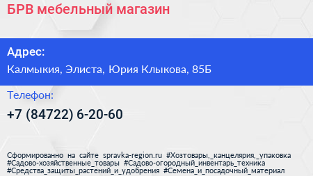 БРВ, мебельный магазин по адресу Калмыкия, Элиста, Юрия Клыкова, 85Б в дальнейшем Организация, размещена в следующих категориях: