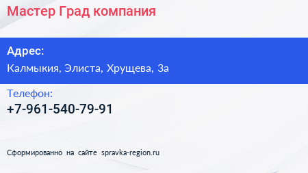 Мастер Град, компания по адресу Калмыкия, Элиста, Хрущева, 3а в дальнейшем Организация, размещена в следующих категориях: