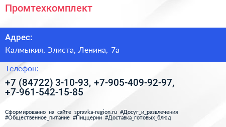 Промтехкомплект по адресу Калмыкия, Элиста, Ленина, 7а в дальнейшем Организация, размещена в следующих категориях: