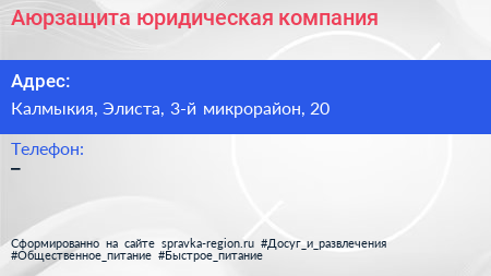 Аюрзащита, юридическая компания по адресу Калмыкия, Элиста, 3-й микрорайон, 20 в дальнейшем Организация, размещена в следующих категориях: