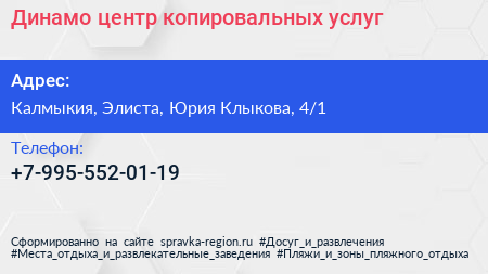 Динамо, центр копировальных услуг по адресу Калмыкия, Элиста, Юрия Клыкова, 4/1 в дальнейшем Организация, размещена в следующих категориях: