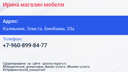 Ирина, магазин мебели по адресу Калмыкия, Элиста, Бимбаева, 33а в дальнейшем Организация, размещена в следующих категориях: