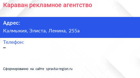 Караван, рекламное агентство по адресу Калмыкия, Элиста, Ленина, 255а в дальнейшем Организация, размещена в следующих категориях: