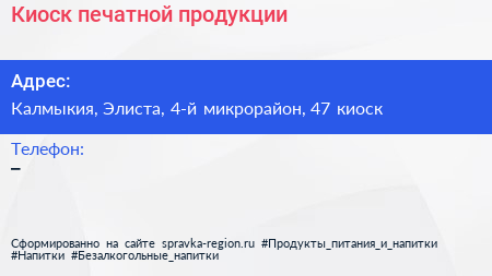 Киоск печатной продукции по адресу Калмыкия, Элиста, 4-й микрорайон, 47 киоск в дальнейшем Организация, размещена в следующих категориях: