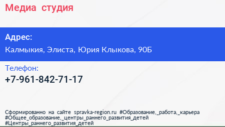 Медиа+, студия по адресу Калмыкия, Элиста, Юрия Клыкова, 90Б в дальнейшем Организация, размещена в следующих категориях: