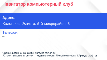 Навигатор, компьютерный клуб по адресу Калмыкия, Элиста, 6-й микрорайон, 8 в дальнейшем Организация, размещена в следующих категориях: