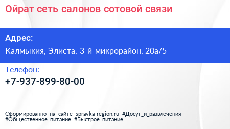 Ойрат, сеть салонов сотовой связи по адресу Калмыкия, Элиста, 3-й микрорайон, 20а/5 в дальнейшем Организация, размещена в следующих категориях: