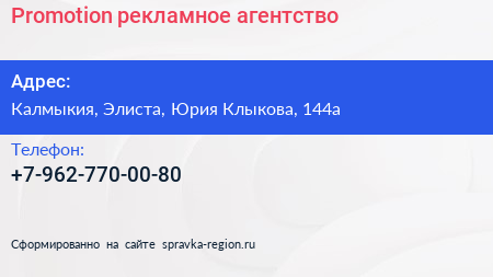 Promotion, рекламное агентство по адресу Калмыкия, Элиста, Юрия Клыкова, 144а в дальнейшем Организация, размещена в следующих категориях:
