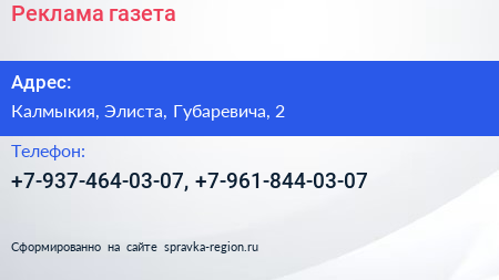 Реклама, газета по адресу Калмыкия, Элиста, Губаревича, 2 в дальнейшем Организация, размещена в следующих категориях: