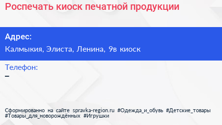 Роспечать, киоск печатной продукции по адресу Калмыкия, Элиста, Ленина, 9в киоск в дальнейшем Организация, размещена в следующих категориях: