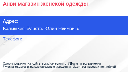 Анви, магазин женской одежды по адресу Калмыкия, Элиста, Юлии Нейман, 6 в дальнейшем Организация, размещена в следующих категориях: