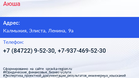 Аюша по адресу Калмыкия, Элиста, Ленина, 9а в дальнейшем Организация, размещена в следующих категориях: