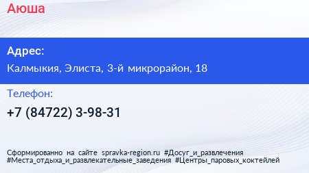 Аюша по адресу Калмыкия, Элиста, 3-й микрорайон, 18 в дальнейшем Организация, размещена в следующих категориях: