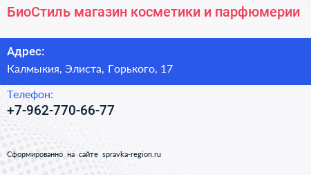 БиоСтиль, магазин косметики и парфюмерии по адресу Калмыкия, Элиста, Горького, 17 в дальнейшем Организация, размещена в следующих категориях: