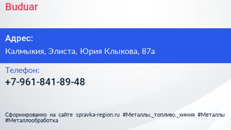 Buduar по адресу Калмыкия, Элиста, Юрия Клыкова, 87а в дальнейшем Организация, размещена в следующих категориях: