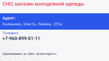 CHIC, магазин молодежной одежды по адресу Калмыкия, Элиста, Ленина, 255а в дальнейшем Организация, размещена в следующих категориях: