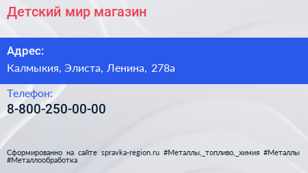 Детский мир, магазин по адресу Калмыкия, Элиста, Ленина, 278а в дальнейшем Организация, размещена в следующих категориях: