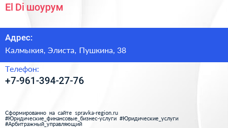 El Di, шоурум по адресу Калмыкия, Элиста, Пушкина, 38 в дальнейшем Организация, размещена в следующих категориях: