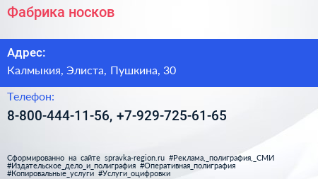 Фабрика носков по адресу Калмыкия, Элиста, Пушкина, 30 в дальнейшем Организация, размещена в следующих категориях: