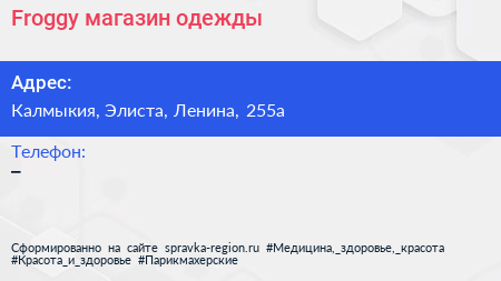 Froggy, магазин одежды по адресу Калмыкия, Элиста, Ленина, 255а в дальнейшем Организация, размещена в следующих категориях: