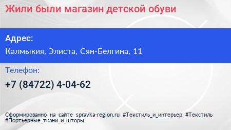 Жили-были, магазин детской обуви по адресу Калмыкия, Элиста, Сян-Белгина, 11 в дальнейшем Организация, размещена в следующих категориях: