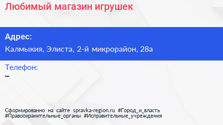 Любимый, магазин игрушек по адресу Калмыкия, Элиста, 2-й микрорайон, 28а в дальнейшем Организация, размещена в следующих категориях: