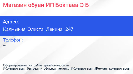 Магазин обуви, ИП Боктаев Э.Б. по адресу Калмыкия, Элиста, Ленина, 247 в дальнейшем Организация, размещена в следующих категориях:
