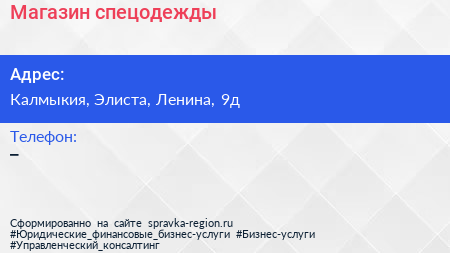 Магазин спецодежды по адресу Калмыкия, Элиста, Ленина, 9д в дальнейшем Организация, размещена в следующих категориях: