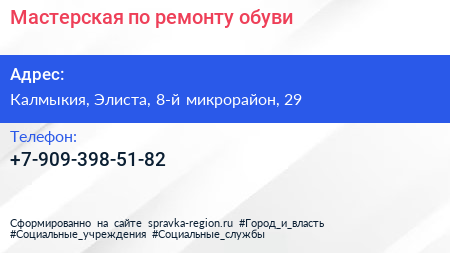 Мастерская по ремонту обуви по адресу Калмыкия, Элиста, 8-й микрорайон, 29 в дальнейшем Организация, размещена в следующих категориях: