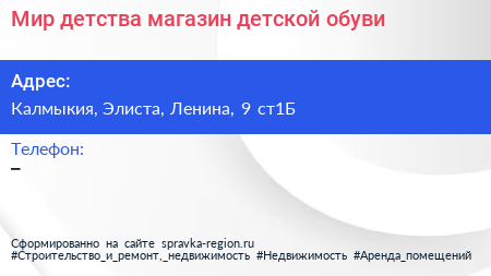 Мир детства, магазин детской обуви по адресу Калмыкия, Элиста, Ленина, 9 ст1Б в дальнейшем Организация, размещена в следующих категориях: