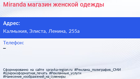 Miranda, магазин женской одежды по адресу Калмыкия, Элиста, Ленина, 255а в дальнейшем Организация, размещена в следующих категориях: