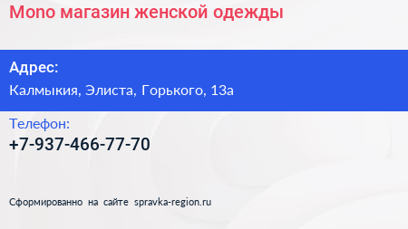 Mono, магазин женской одежды по адресу Калмыкия, Элиста, Горького, 13а в дальнейшем Организация, размещена в следующих категориях: