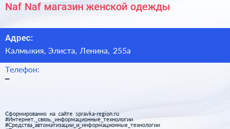Naf Naf, магазин женской одежды по адресу Калмыкия, Элиста, Ленина, 255а в дальнейшем Организация, размещена в следующих категориях: