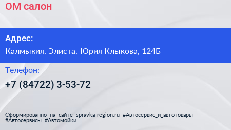 ОМ, салон по адресу Калмыкия, Элиста, Юрия Клыкова, 124Б в дальнейшем Организация, размещена в следующих категориях: