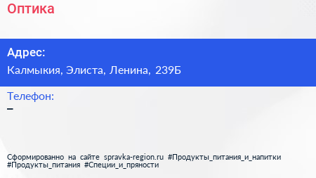 Оптика по адресу Калмыкия, Элиста, Ленина, 239Б в дальнейшем Организация, размещена в следующих категориях: