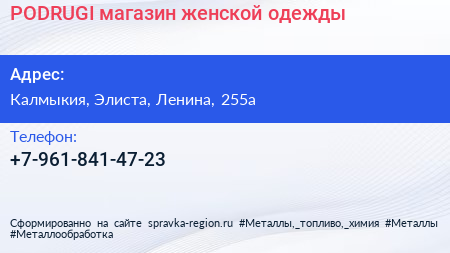 PODRUGI, магазин женской одежды по адресу Калмыкия, Элиста, Ленина, 255а в дальнейшем Организация, размещена в следующих категориях: