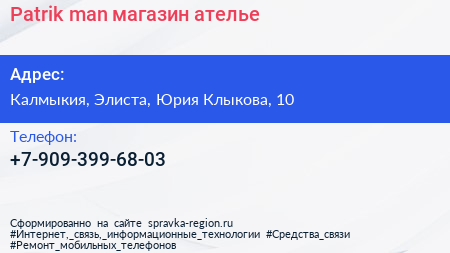 Patrik man, магазин-ателье по адресу Калмыкия, Элиста, Юрия Клыкова, 10 в дальнейшем Организация, размещена в следующих категориях: