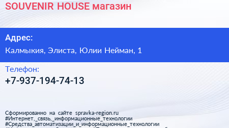 SOUVENIR HOUSE, магазин по адресу Калмыкия, Элиста, Юлии Нейман, 1 в дальнейшем Организация, размещена в следующих категориях: